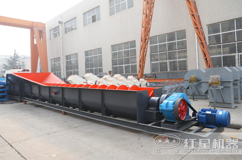 洗石機(jī)由槽體、減速機(jī)、電機(jī)、中心軸、螺旋葉片、支架組成。支架焊接在中心軸上,螺旋葉片裝好后用螺栓壓緊,使葉片不下垂不變形,有效延長(zhǎng)設(shè)備的使用壽命。