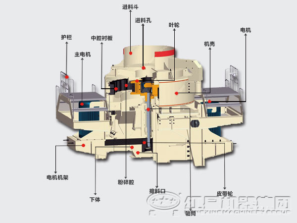 制砂機一般結(jié)構(gòu):制砂機主要由進料口、溢料裝置、轉(zhuǎn)子、破碎腔、驅(qū)動裝置及機座這幾大部分組成。其工作原理是:物料由進料口進入破碎機,在破碎機頂部由溢料裝置將物料分為兩部分,一部分經(jīng)溢料口進入破碎腔,另一部分直接進入轉(zhuǎn)子,物料以50-80m/s的速度從轉(zhuǎn)子內(nèi)三個均布的流道口發(fā)射出去,與溢料流發(fā)生碰撞,然后一起沖向破碎腔內(nèi)的物料墊,被物料墊反彈,斜向上沖擊到破碎腔的頂部,又改變其運動方向,偏向下運動,與溢流石料重新組合,這樣每塊物料在破碎腔內(nèi)受到兩次甚至多次破碎作用,而后從破碎腔落下由排料口排出。在整個破碎過程中實現(xiàn)的是物料與物料的碰撞,有效地減少了磨損。